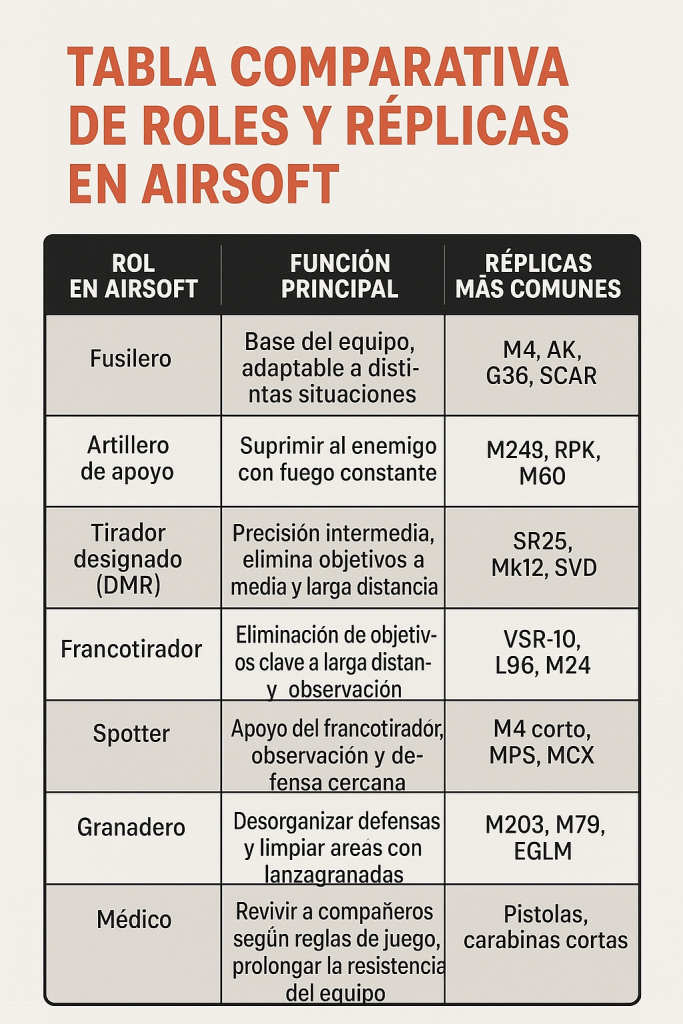 No se trata solo de portar una réplica, sino de cumplir una función que aporta equilibrio, estrategia y realismo al juego. Los roles en airsoft permiten que el equipo pueda actuar de forma organizada, con jugadores especializados en movilidad, apoyo o precisión.